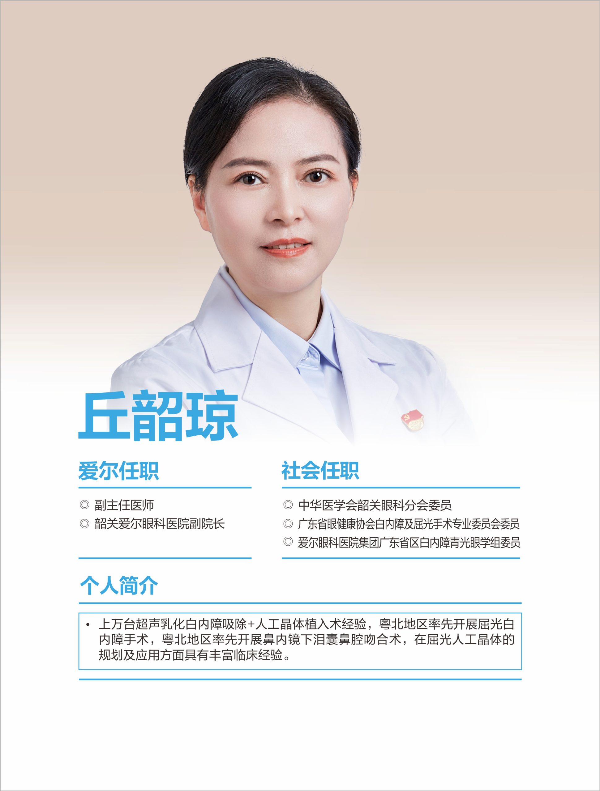 韶關愛爾眼科醫(yī)院有限公司白內障團隊擁王愛琴院長(愛爾眼科粵北區(qū))、丘韶瓊院長、郭俊豪主任等多位專科醫(yī)生,具備同步國際的白內障手術能力,能熟練開展各項常規(guī)及疑難白內障手術。 可開展微切口煥晶白內障手術,植入多焦晶體或多焦+散光矯正晶體,在治療白內障同時同步解決遠視/近視、老花眼、角膜散光等屈光問題,醫(yī)生手術經驗豐富,為眾多患者帶來更舒適的視覺。